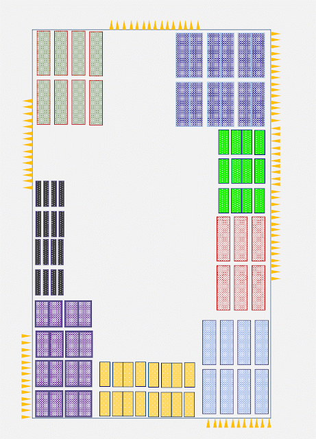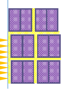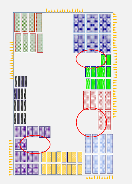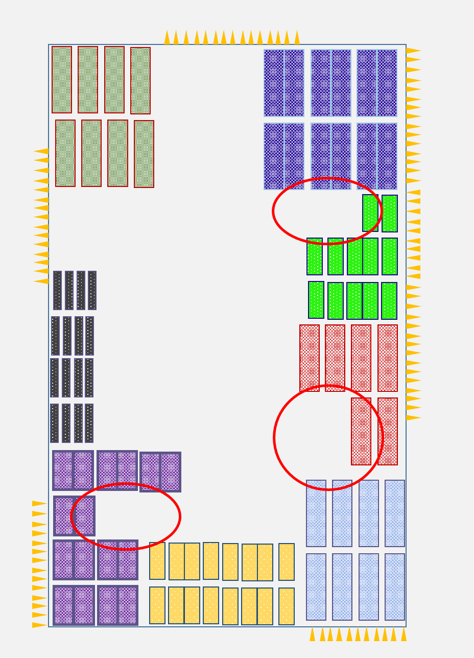 To avoid congestion in the macro channels, We apply partial placement blockage in the macro channel so that we can control the placement density. We can also apply the partial placement blockage in the region between io pins and macro as shown in the figure below. All yellow region is showing the partial placement blockage region, we can set the placement density in these regions.